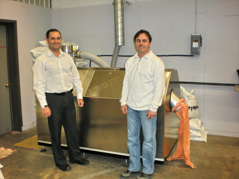 Officials of the Société des Alcools du Quebec proudly pose in front of the Big Hanna composter model T60 recently installed at the Quebec SAQ distribution center.